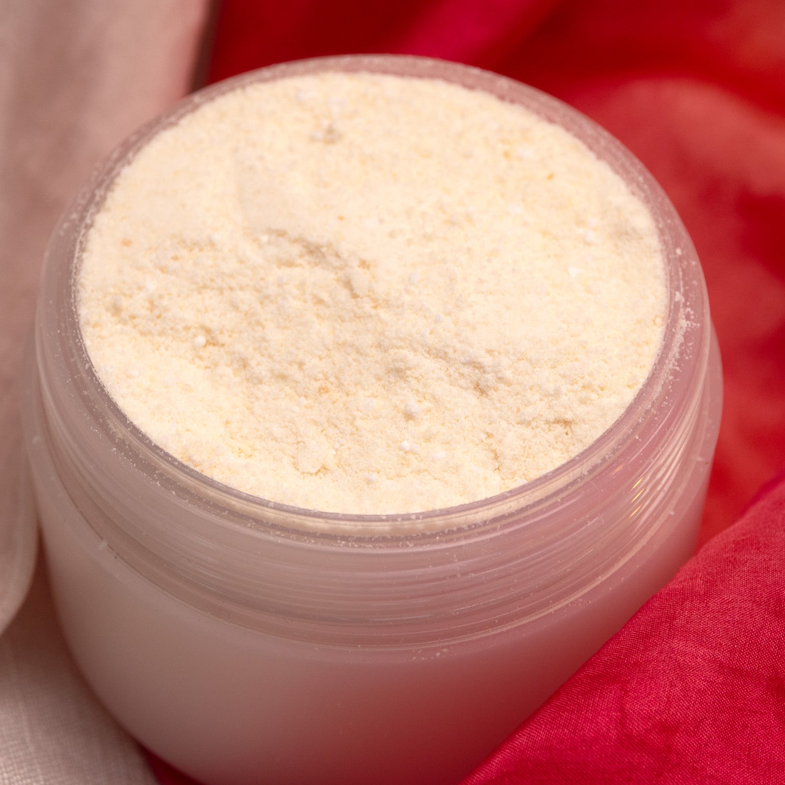 Ein Teelöffel Pulver ohne Wasser in die Handfläche geben und kräftig (wie beim Händewaschen) alle rauen Stellen damit abrubbeln. Erst danach mit viel Wasser abspülen. Durch das Salz kann es an offenen Stellen etwas brennen, Salz desinfiziert aber bekanntlich...oder wer empfindlich ist spart diese Bereiche einfach aus. Das Resultat spricht schon nach der ersten Anwendung für sich: Überstehende Hautschuppen werden durch das Salz entfernt und das entölte Cocospulver fettet die Haut ausreichend nach. Zurück bleibt ein schönes Hautgefühl.