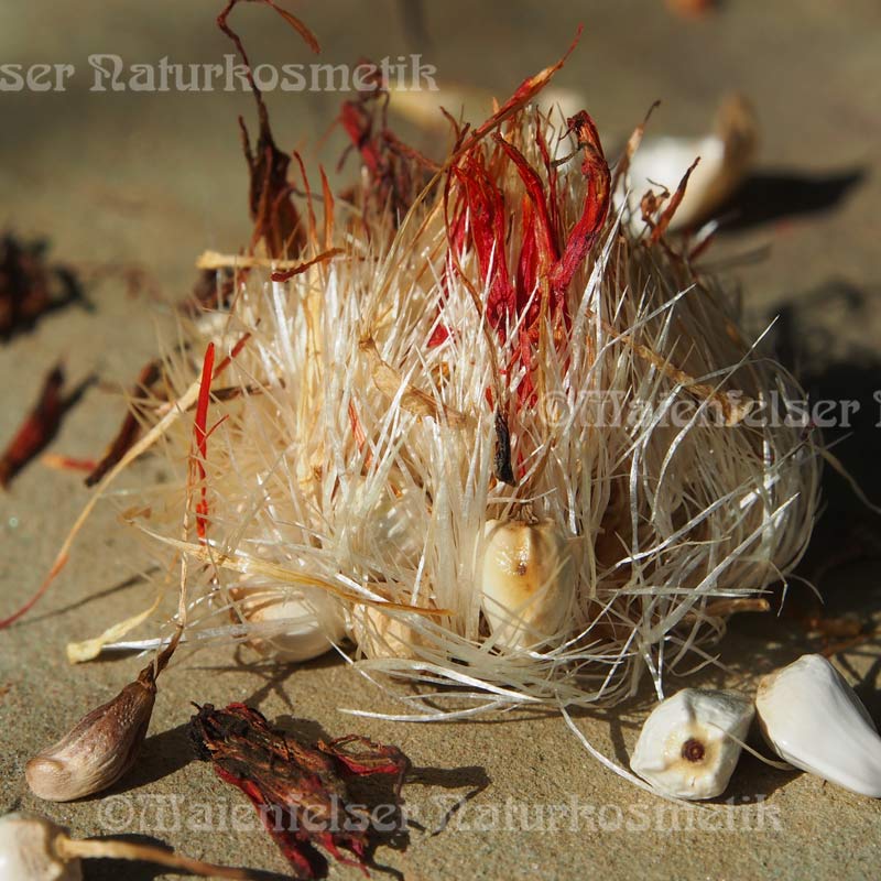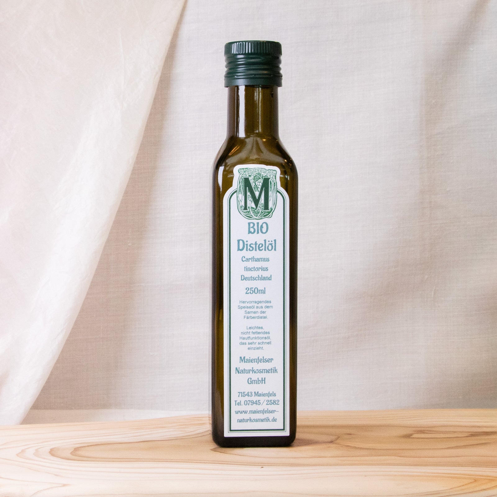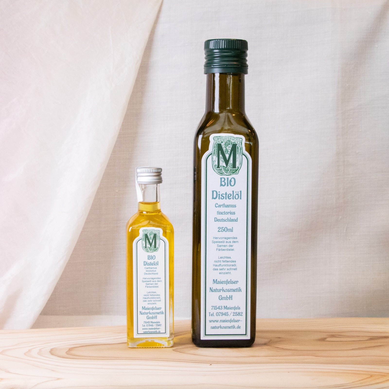 Distelöl wird aus den Samen der altbekannten Färberdistel gepresst. Früher hauptsächlich als Färberpflanze eingesetzt (Saflorrot / Carthamin), wird sie heute vorwiegend zur Ölgewinnung angebaut. Das gelbe Öl hat einige Besonderheiten aufzubieten, welches nur in Distelöl vorkommt.