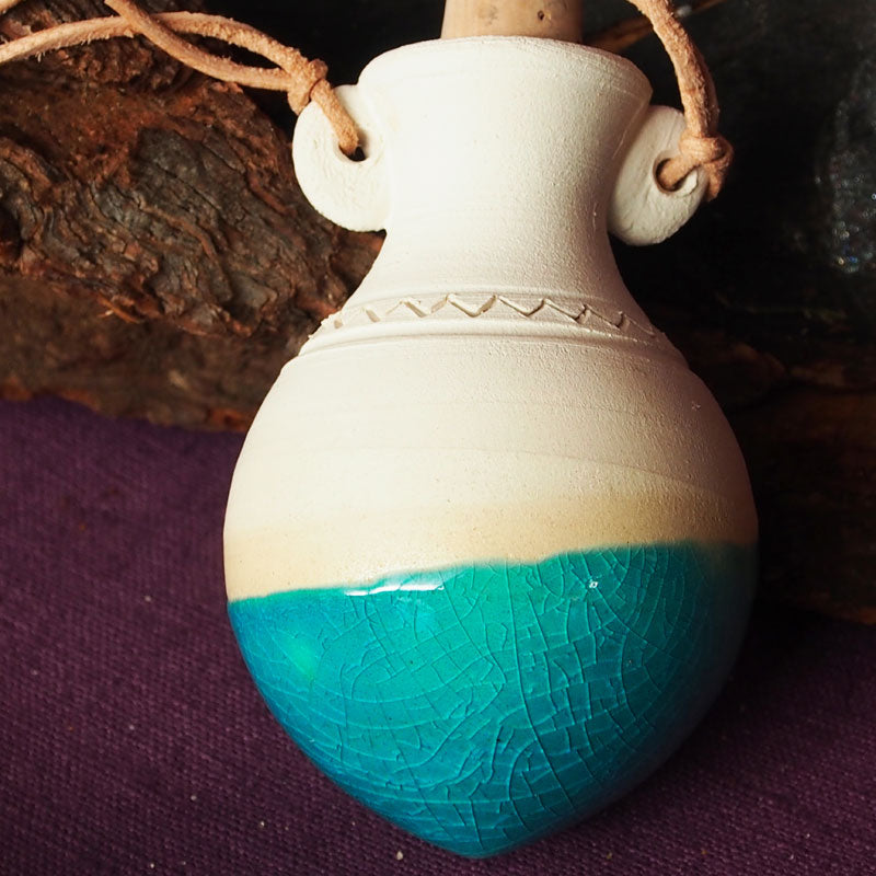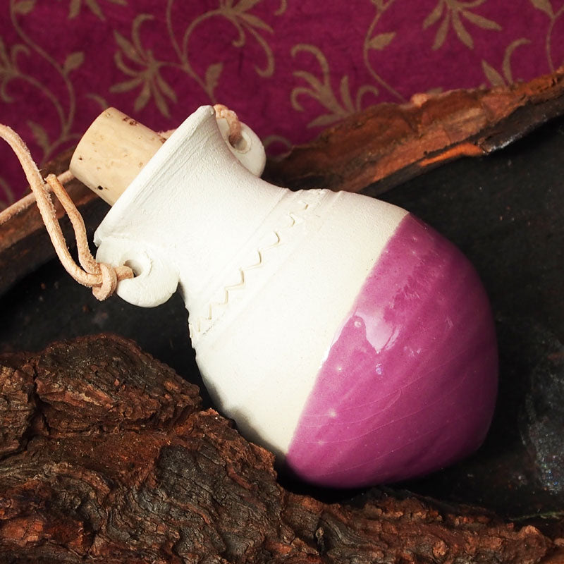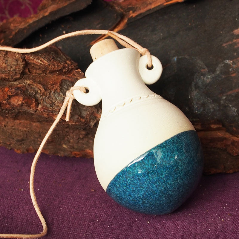 Vor langer, langer Zeit, - manche Stammkunden erinnern sich vielleicht noch daran, hatten wir schöne kleine Duftamphoren in unserem Programm. Dann wanderte der Töpfer aus und lange mußten wir suchen, bis wir einen Töpfer fanden, der die Duftamphoren nach unseren Wünschen wieder herstellt. Jetzt aktuell im Programm dürfen wir Ihnen diese kleinen Amphoren wieder vorstellen.  Es gibt sie in 3 Farben. Der untere Teil ist glaciert, damit so manch dünnflüssige äther. Öl nicht durchtropft und der obere Teil ist gut geeignet um die darin befindliche Essenz - langsam aber stetig zum verdunsten zu bringen. Mitgeliefert werden auch der Korken und die Aufhängung (feine Lederschnüre).