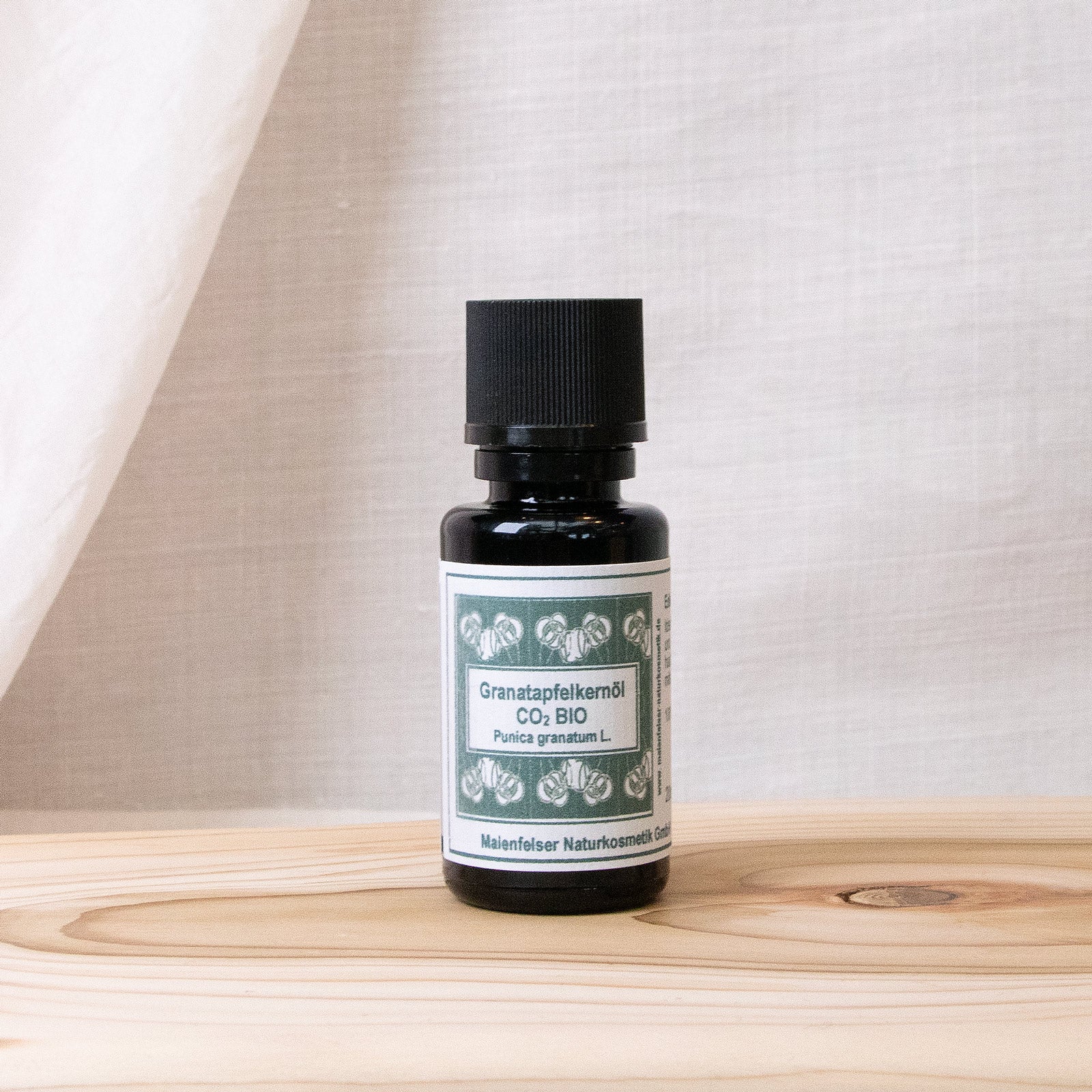 Der Granatapfelbaum kommt ursprünglich vor allem im südwestlichen Asien von der Türkei über den Iran, Syrien bis nach Indien vor. Heute sieht man ihn auch rund ums Mittelmeer. Die rote Frucht des Granatapfels beinhaltet zahlreiche erbsengrosse Samen mit roter Aussenschicht, die entweder kaltgepresst oder in CO2-Extraktion ein sehr wertvolles Öl ergeben. Das hellgelbe Öl hat einen lieblichen, leicht süßen Duft. Durch den hohen Anteil einer ungewöhnlich seltenen Ölsäure - der Pumicinsäure, die zu den mehrfach ungesättigten Fettsäuren (Omega 5) gezählt wird - zeigt das Granatapfelkernöl eine starke antioxidative Eigenschaft.