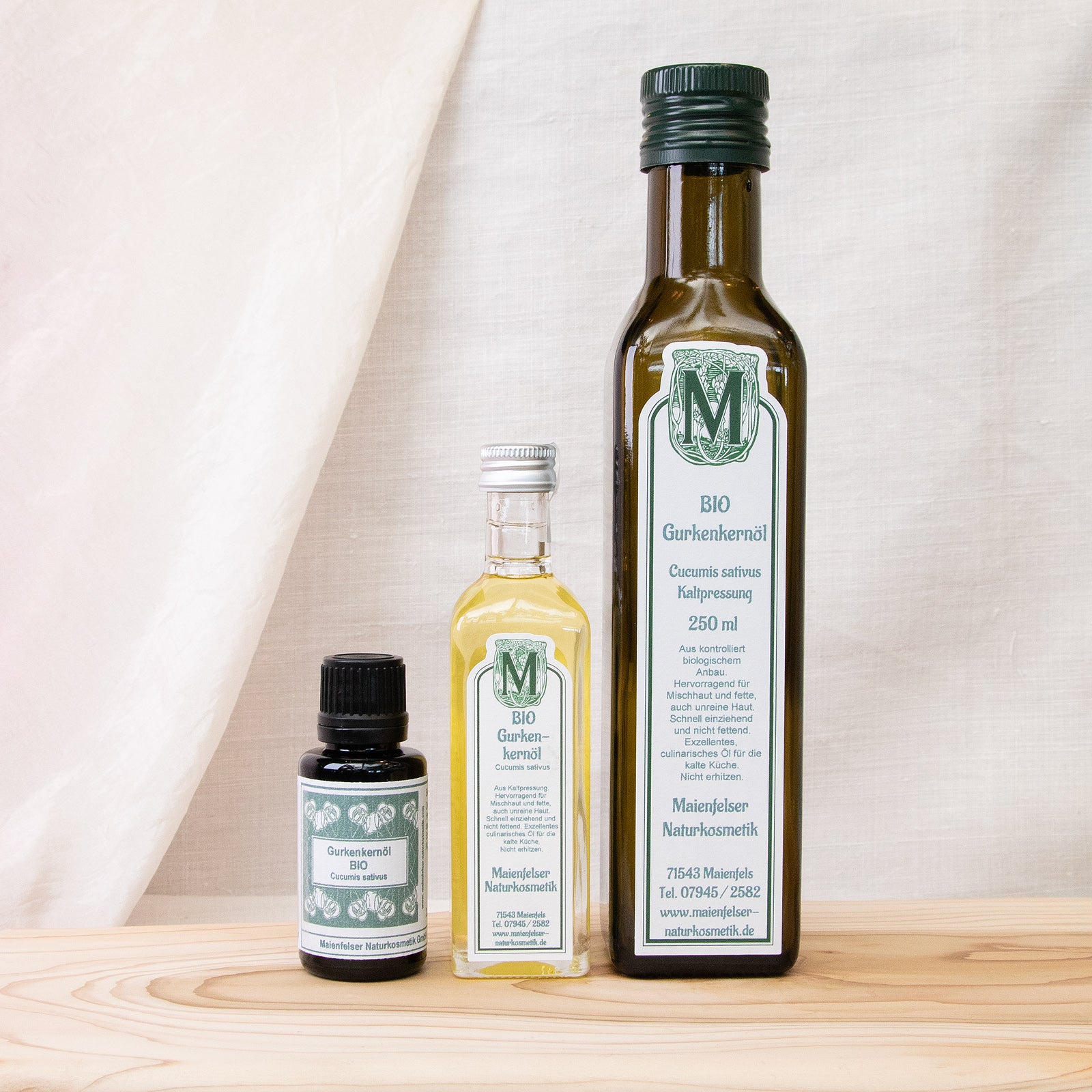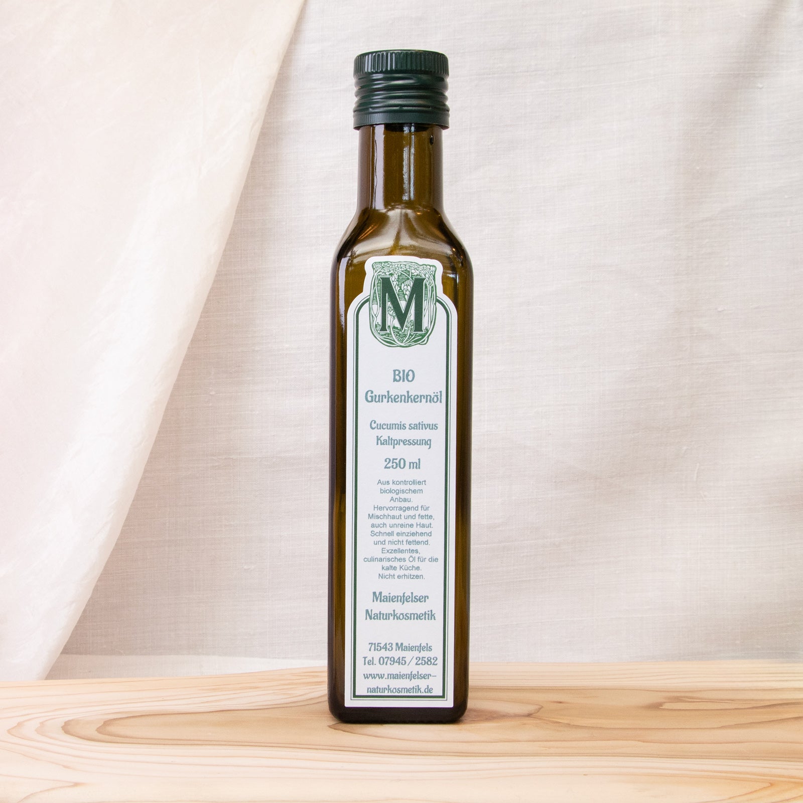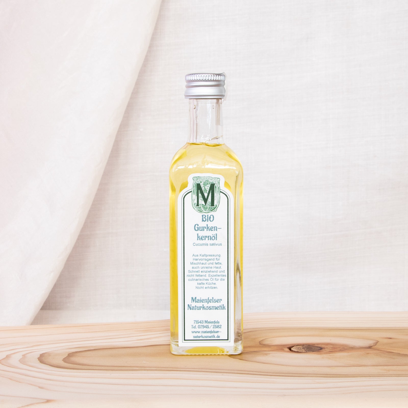 Jawohl, aus den hellen, flachen Gurkenkernen, die man auch im Gurkensalat entdeckt, wird dieses Öl im Kaltpressverfahren gewonnen. Es zeichnet sich durch einen hohen Linolsäuregehalt aus und ist von gelbgrüner Farbe mit angenehmem leicht aromatischem Geschmack.