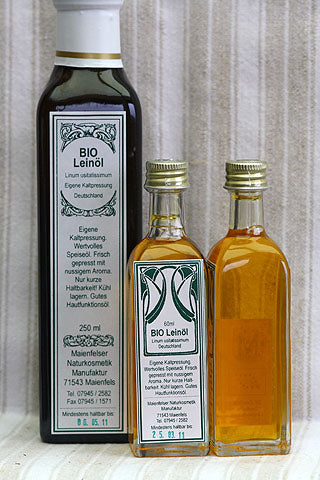 Leinöl zählt zu den wertvollsten kaltgepressten Pflanzenölen durch den sehr hohen Gehalt der wertvollen Alpha-Linolensäure. Leider zählt Leinsamenöl zu den schnell verderblichen Ölen. Schon nach wenigen Wochen bildet sich eine Bitternote, die dann stetig zunimmt und nach 8–10 Wochen das Öl nicht mehr genießbar macht. Entgegen aller Meinungen aus der Literatur schmeckt frisch gepresstes Leinsamenöl angenehm mild, nussig mit einer feinen aromatischen Note und kann als ausgesprochen wohlschmeckend eingeordnet werden. Leinöl kann man eigentlich nur direkt beim Ölmüller kaufen, eben wegen seiner kurzen Haltbarkeit. Von mir getestetes Leinöl in Reformhäusern, Bioläden oder Supermärkten ist entweder ungenießbar durch die extreme Bitternote oder schmeckt neutral nach gar nichts und ist dann raffiniert, was den hohen Gesundheitsgehalt des Leinöls vermindert. Wir pressen 1 - 2 Mal  im  Monat  frisches  Leinsamenöl -  Saatgut  aus  biologischem  Anbau. - von der goldenen Sorte, die qualitativ etwas höher liegt als der braune Lein. Bewahren Sie Ihr Leinöl kühl und dunkel auf, das erhöht die Stabilität um ein paar Tage. Aber! Altes Leinöl wird für die Holzbehandlung immer besser, je älter es ist, zur Imprägnierung von Holzmöbeln oder Holzfassaden im Außenbereich. Es bildet einen rissfreien Schutz vor Witterungseinflüssen oder im Wohnbereich als giftfreie Lasierung z. B. im Kinderzimmer. Vorsicht: Leinöllappen oder Pinsel können sich selbst entzünden. Nach Gebrauch in einem luftdichten Glas aufbewahren oder mit Seife auswaschen.