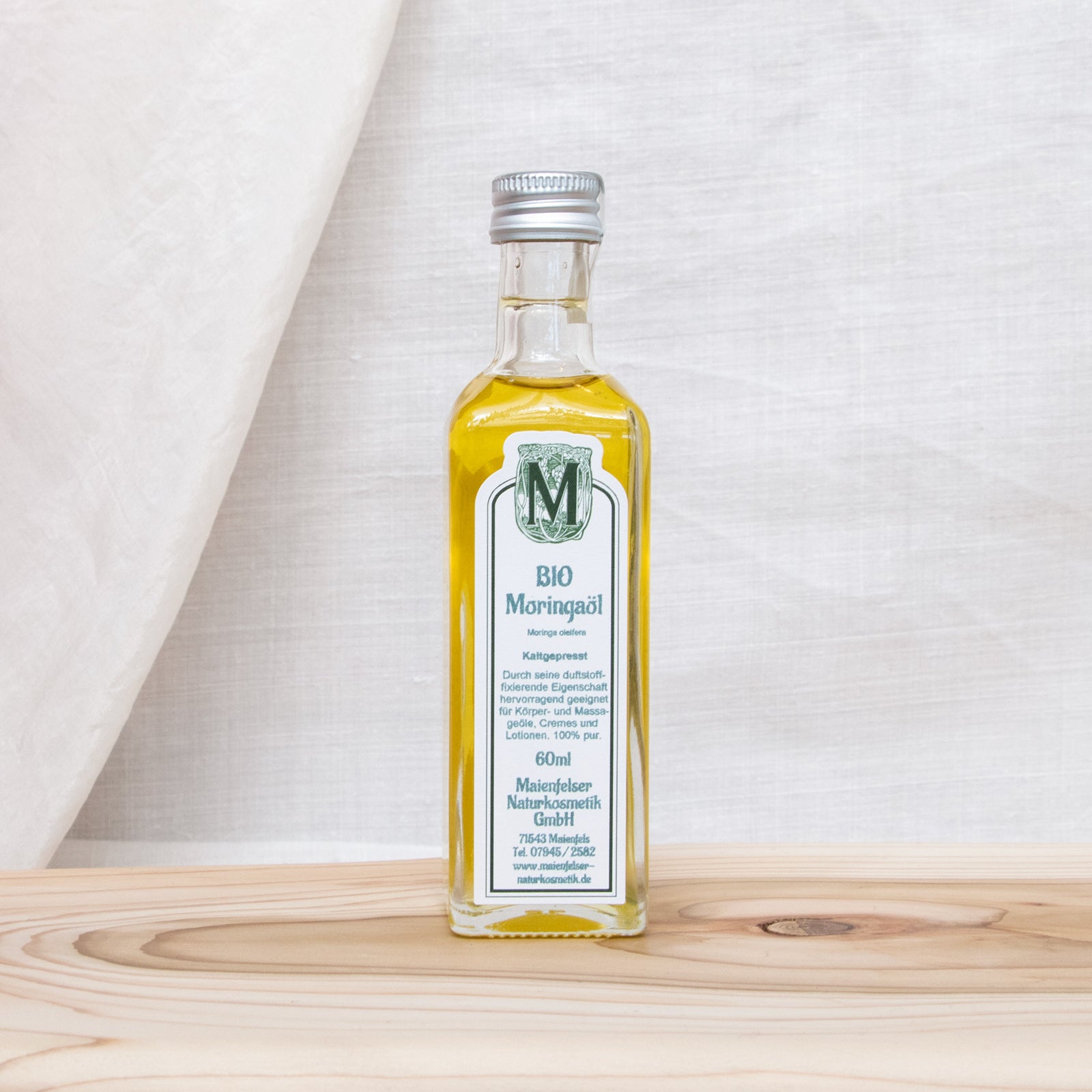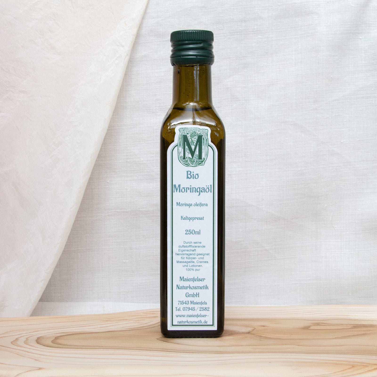 Vormals unter dem madagasischen Namen 'Ananambo' aufgelistet, haben wir dieses Öl unter seinem botanischen Namen eingereiht, da der alte Name doch recht unbekannt war und viele das Moringaöl nicht gefunden haben. Man sollte mit dem Begriff 'Wunder' sparsam umgehen, aber beim Moringabaum kann man schon von einem Wunderbaum sprechen, da er mit wundersamen Eigenschaften in dieser Kategorie aufwarten kann. Ursprünglich aus Indien kommend, wächst er auch in anderen tropischen Gebieten von Afrika, Südamerika und Madagaskar. Seinen Namen hat er von den knolligen Wurzeln, die durch das Senfölglykosid nach Meerrettich riechen, und durch den außergewöhnlich hohen Anteil von Behensäure im Samenöl. Das Wunderbare: alles an diesem Baum ist ess- oder verwertbar. Seine weißduftenden Blüten und seine Blätter können roh oder gekocht als Salat, Gemüse oder Tee verzehrt werden. In der Ayurveda ist der Baum schon seit Jahrtausenden bekannt und berühmt und zählt zu den wichtigsten Aufbau- und Stärkungsmitteln. Seine schotenähnlichen essbaren Früchte sehen aus wie lange grüne Bohnen ('Sign' oder modern ausgedrückt 'drumsticks') und enthalten erbsenähnliche Samen, aus denen man ein hervorragendes Pflanzenöl pressen kann. Sein Öl ist reich an ungesättigten Fettsäuren und an der wertvollen Behensäure und hat eine sehr geringe Ranzität. Das heißt, das Moringaöl bleibt auch bei hohen Außentemperaturen auf Jahre hin stabil und wird nicht ranzig. Ein weiterer Umstand, der diesem Baum den Namen 'Wunderbaum' gab, ist die wasserreinigende Kraft des Moringasamens. 0,2 g des gemahlenen Samens reichen aus um 1 Liter verdrecktes Wasser in Trinkwasserqualität zu reinigen. Er hat die Eigenschaft, sich mit den Schwebeteilchen im Wasser zu verbinden. In diesem Prozess werden auch Bakterien, Viren und sonstige Krankheitskeime mit eingebunden und abgetötet.