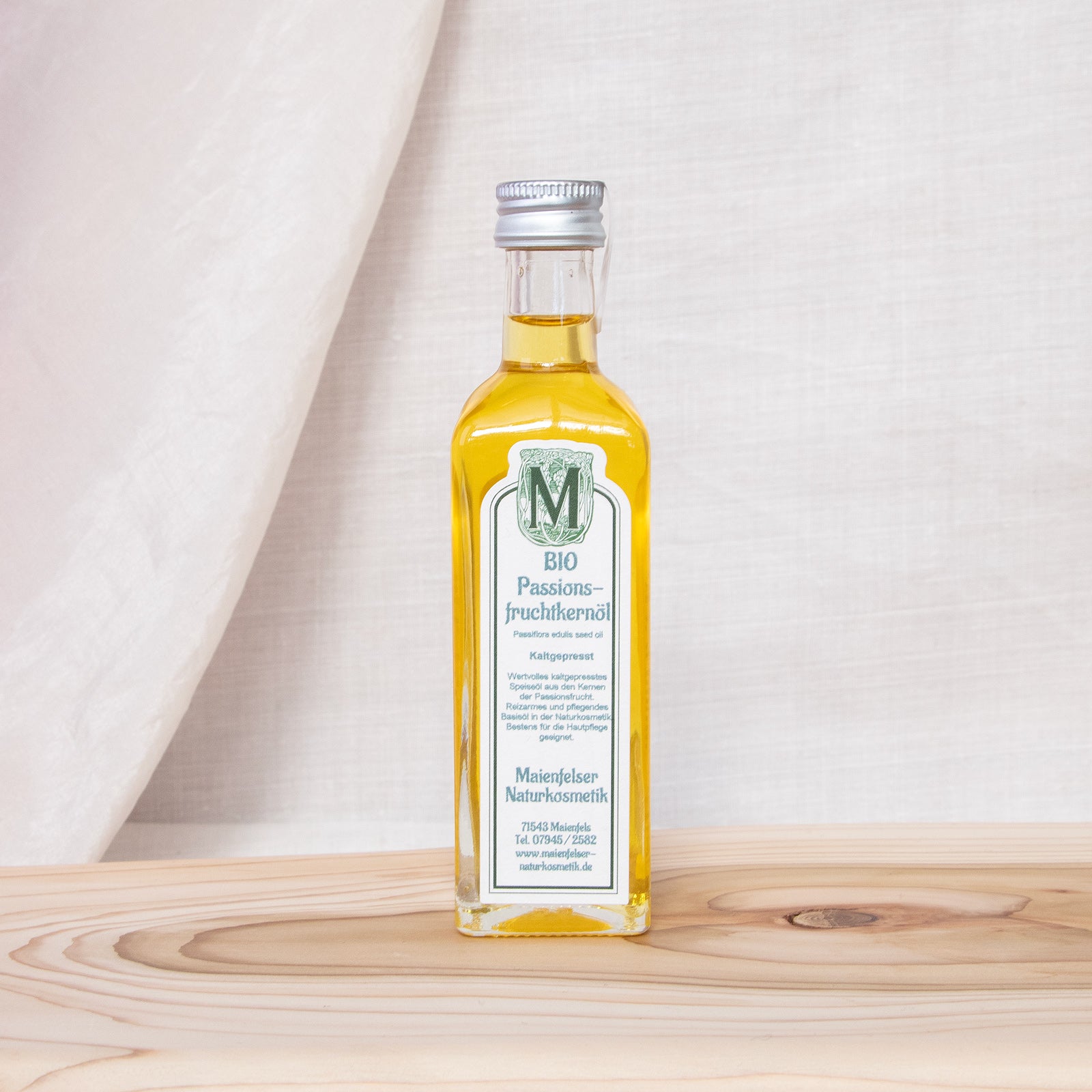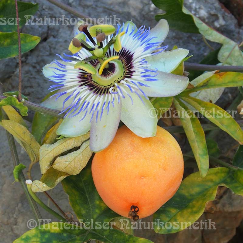 Die Passionsfruchtblume ist oftmals in unseren Zimmern als Schmuckpflanze anzutreffen. Mit ihren wunderschönen weiß-violetten Blüten ist diese Kletterpflanze äußerst beliebt, aber zu einer Fruchtbildung kommt es selten. Die orangefarbige Maracuja-Frucht ist essbar und wohlschmeckend und die darin enthaltenen braungelben Samen werden zur Ölgewinnung genutzt. Das Passionsfruchtkernöl wird durch mechanische Kaltpressung gewonnen, ist von hellgelber Farbe mit einem angenehmen Geruch.
