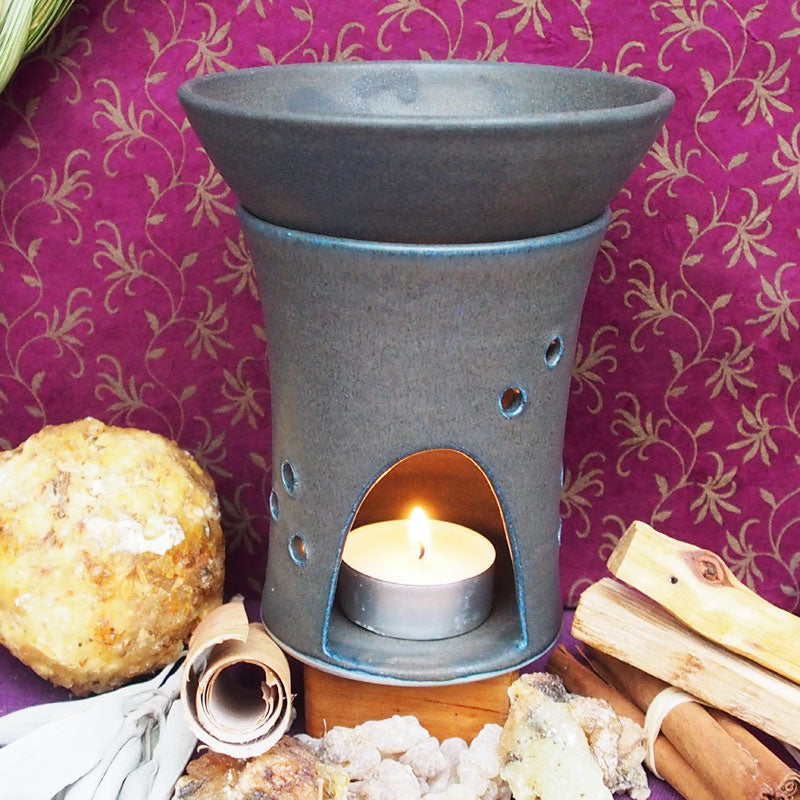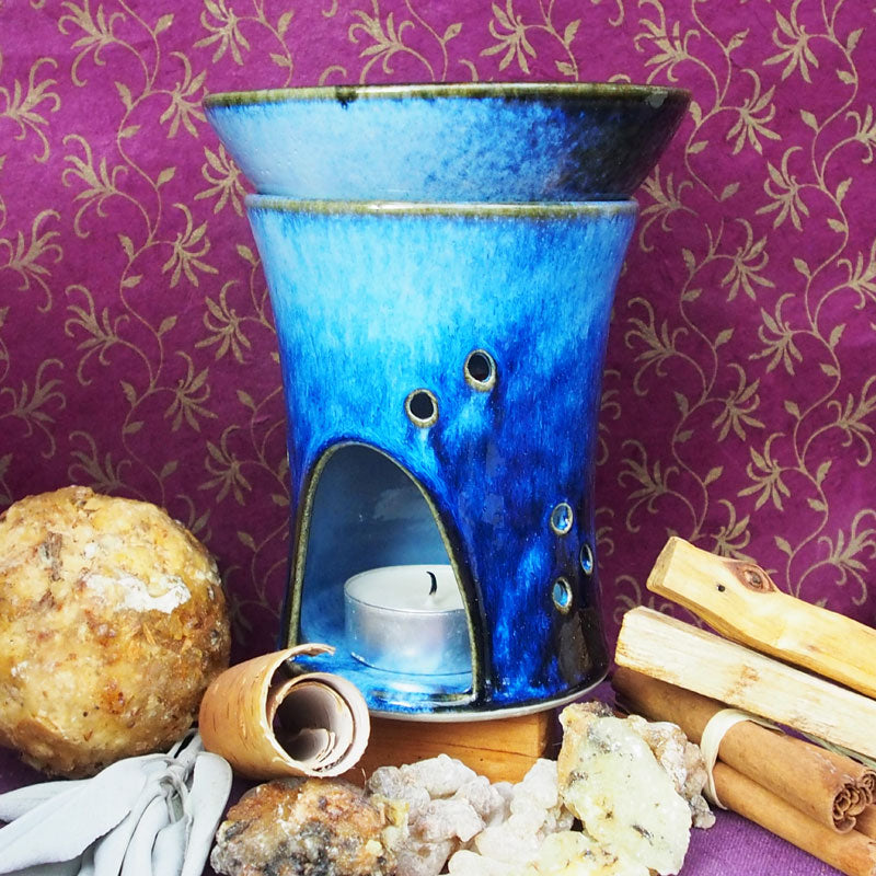 Hier haben wir eine Aromalampe, die auch als Räucherlampe benutzt werden kann.  Das Schälchen auf der Aromalampe ist sehr gut geeignet für eine sanfte leichte Beduftung durch ein äther. Öl, das in der Schale mit Wasser zugefügt werden kann. Des Weiteren kann auch mit der gleichen Schale eine Räucherung mit Kräuter, Räucherpulver oder Weihrauch ausgeführt werden.  Hier kann sowohl mit, wie auch ohne Kohletablette geräuchert werden. Hier reicht es ohne Sand ein Räucherpulver und auch mit etwas Sand Weihrauch in das Schälchen zu legen und mit einem Teelicht zu aktivieren. Das Ganze ist dann viel sanfter und milder wie eine Kohleräucherung. Es gibt sie in 2 Farbvarianten. Die Aromalampe ist ca. 13 cm hoch und mit einer kräftigen blau-glänzenden oder matten grau-blauen Glasur versehen. Das Schälchen ist zum Reinigen abnehmbar...