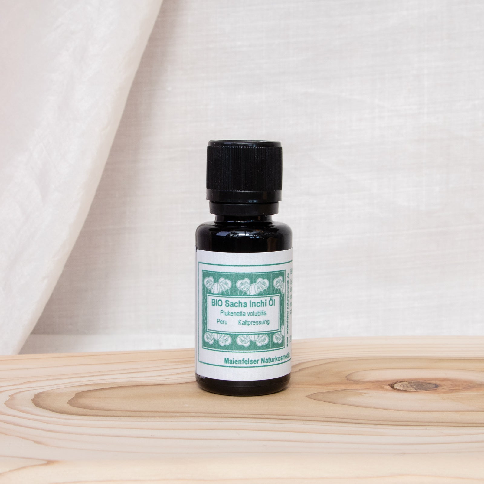 Sacha Inchi, die Inka-Erdnuss, stammt von einer Kletterpflanze und kommt vorwiegend aus Peru. Das gelbe Öl hat einen angenehmen Geschmack nach Kräutern mit einer grasigen Note. Das Ölsäure-Spektrum von Sacha-Inchi ist sehr außergewöhnlich. Kein derzeit bekanntes Pflanzen- oder Nussöl weist eine ähnliche Zusammensetzung auf, was es in der Ernähung und in der Kosmetik besonders hervorhebt. Nicht einmal Leinöl, das auch einen vergleichsweise hohen Anteil an der wertvollen Alpha-Linolensäure enthält, kommt diesem Öl nahe. Durch den hohen Vitamin-E-Anteil ist das Sacha-Inchiöl zudem sehr lange haltbar.