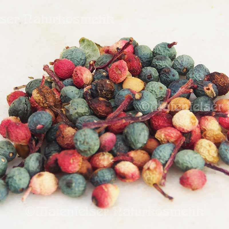 Mit einer bunten Farbenvielfalt überraschen die Terpentinbeeren von einer anderen Stammpflanze. Sowohl zum Würzen (wagen Sie es ruhig einmal - Pfannkuchen, Gebäck etc.) wie auch zum Räuchern eignen sich diese bunten Terpentinbeeren. Von blau bis rot ist die ganze Farbenpracht vorhanden. Sehr gut auch zum dekorieren im kulinarischen Bereich oder in bunten Räuchermischungen.